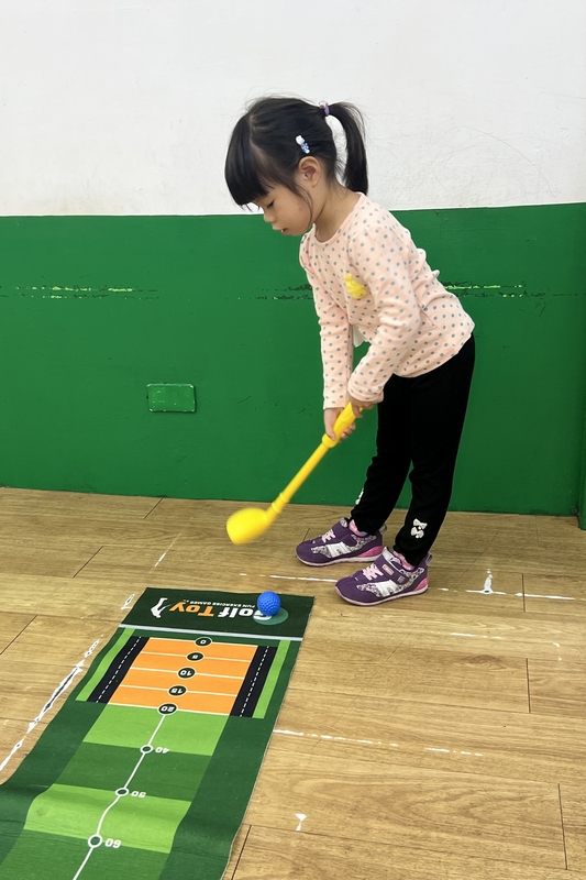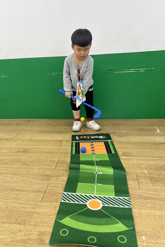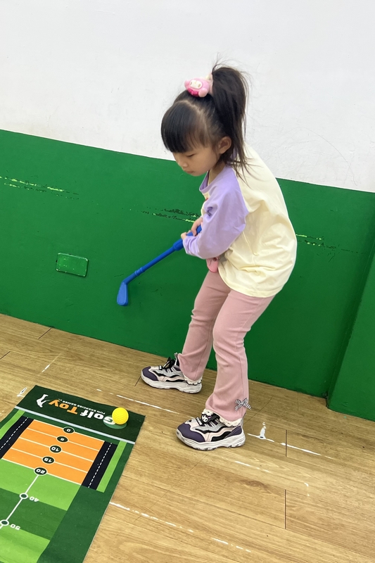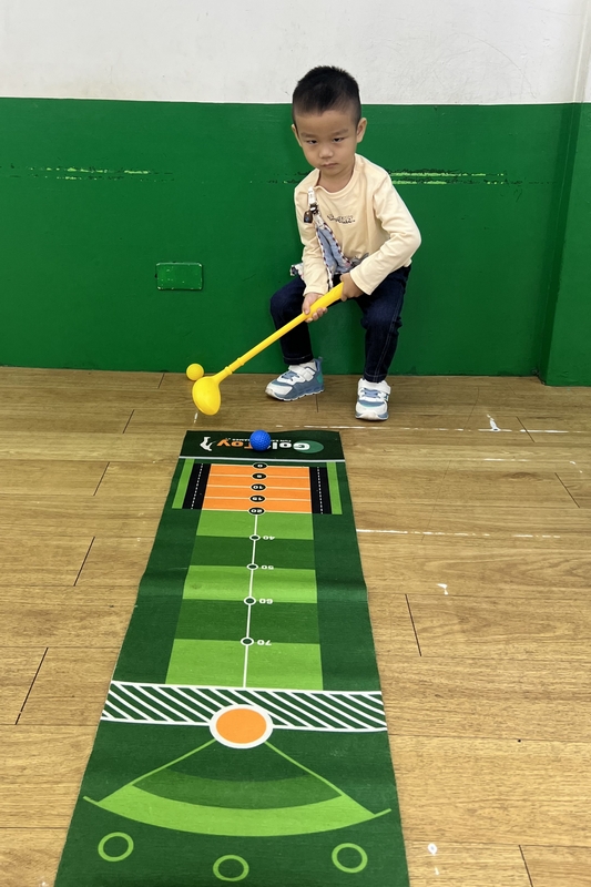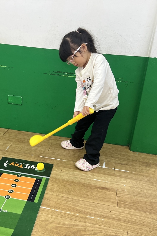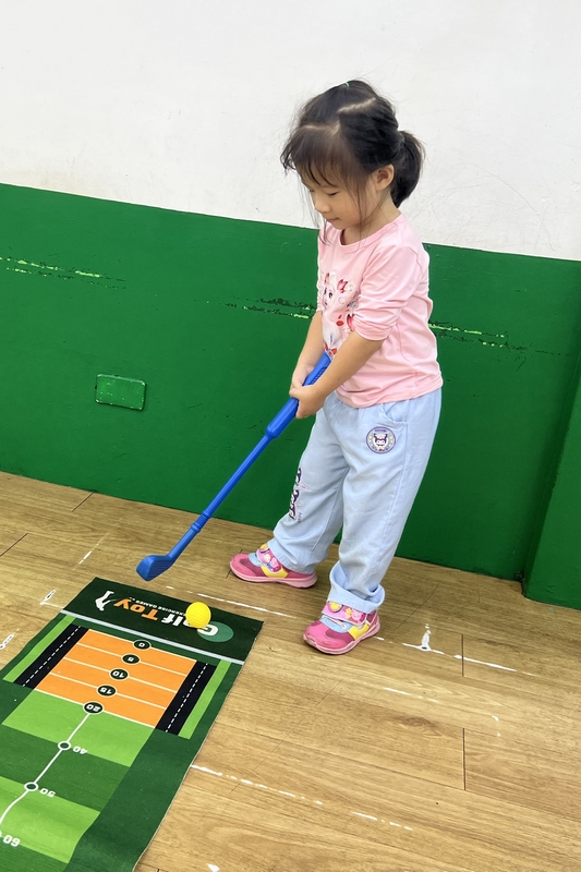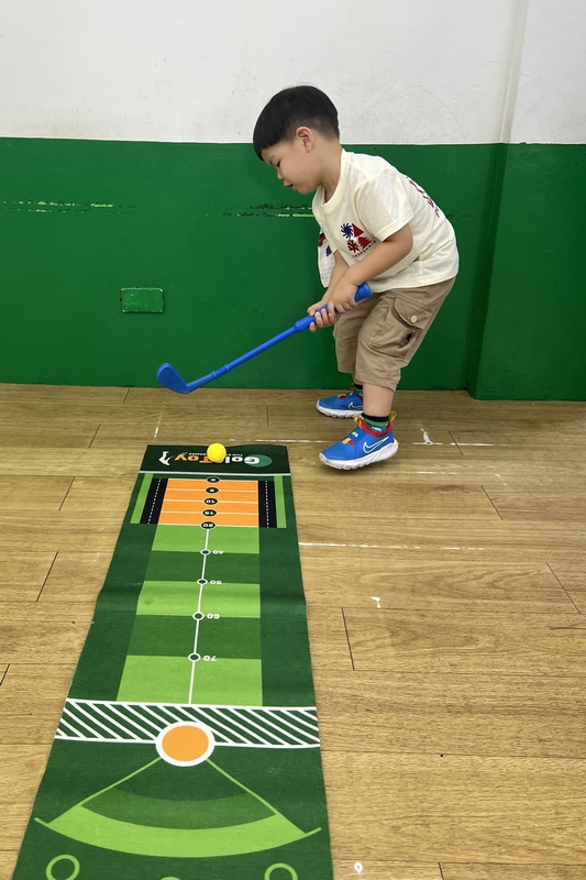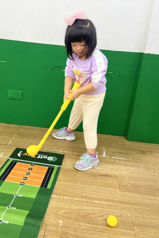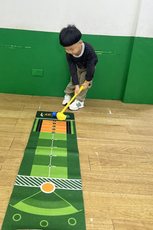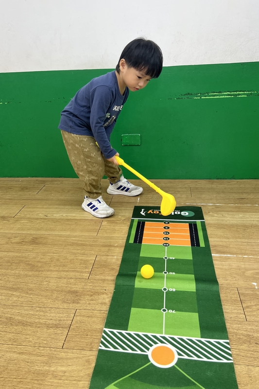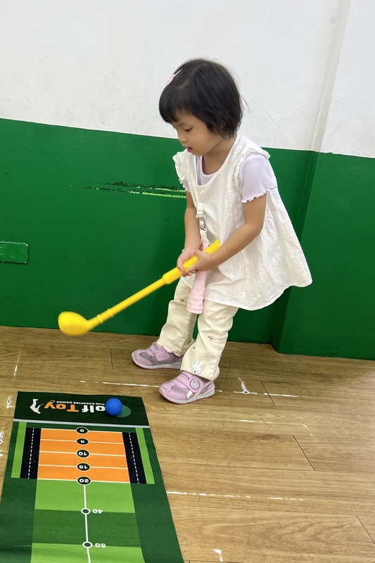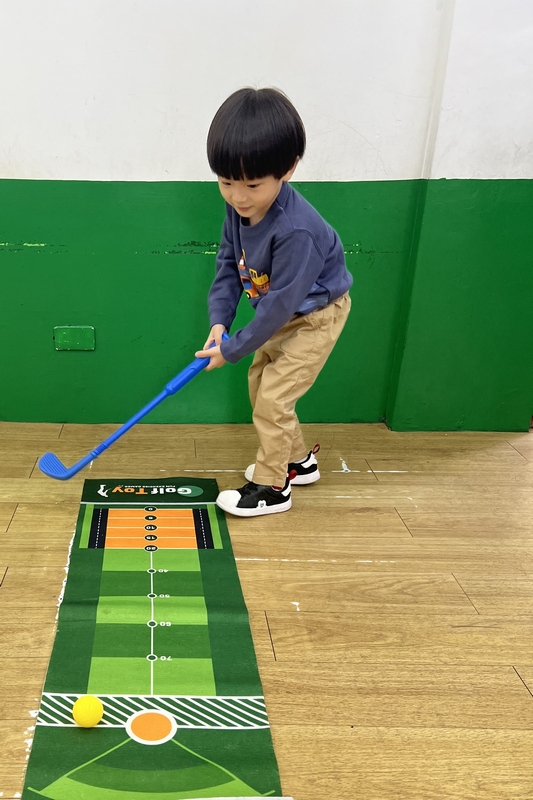 老師準備高爾夫遊戲球具,讓小朋友實際揮桿;過程中小朋友架式十足並且享受擊球的樂趣。