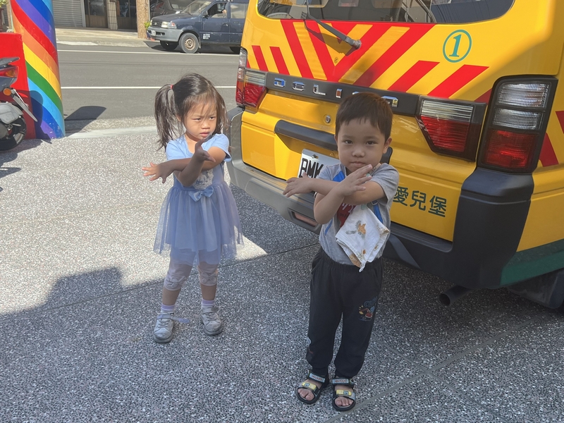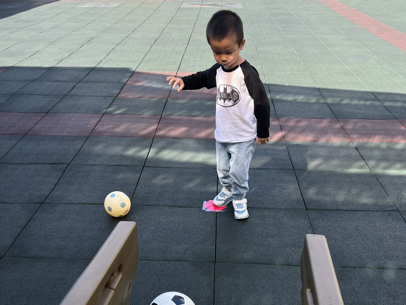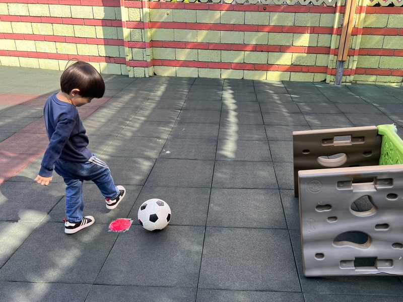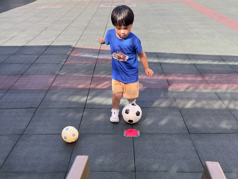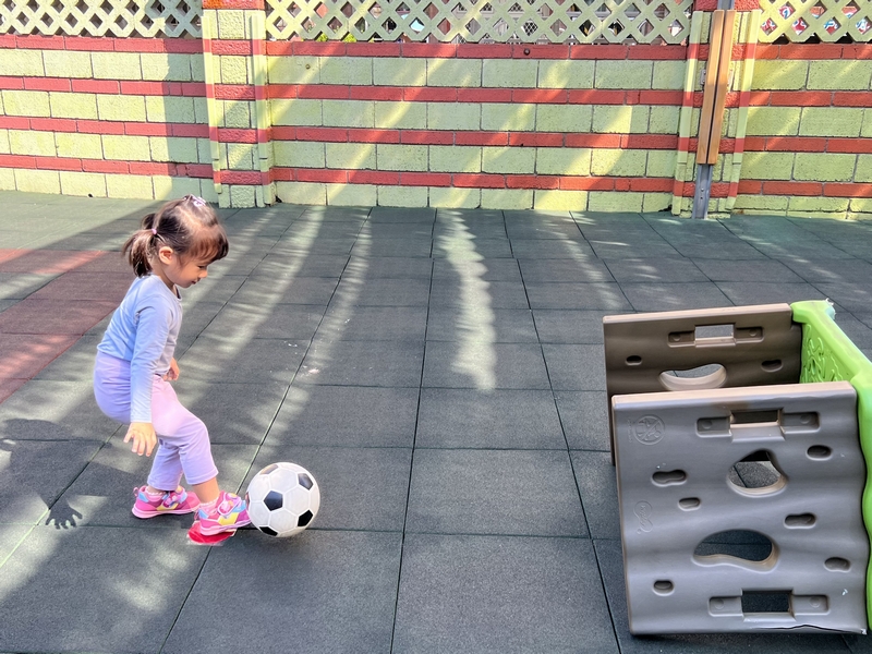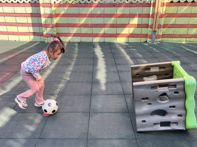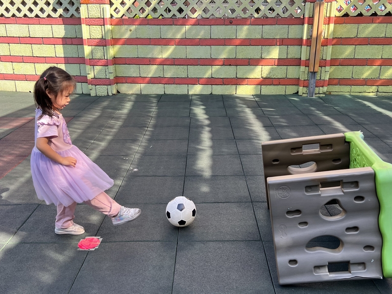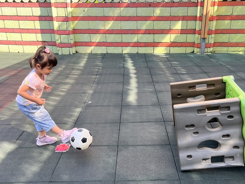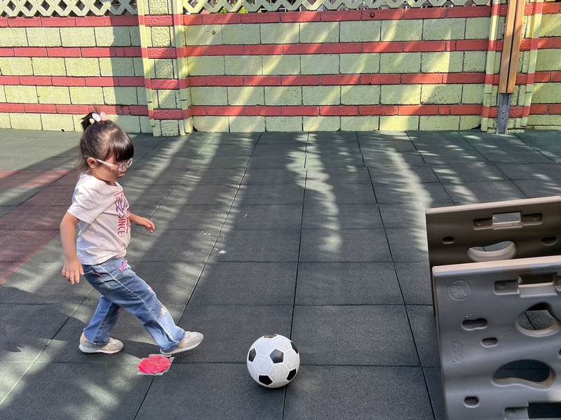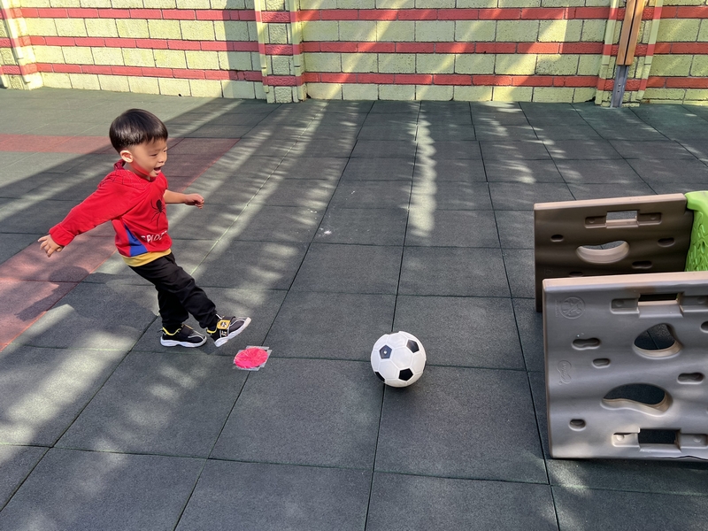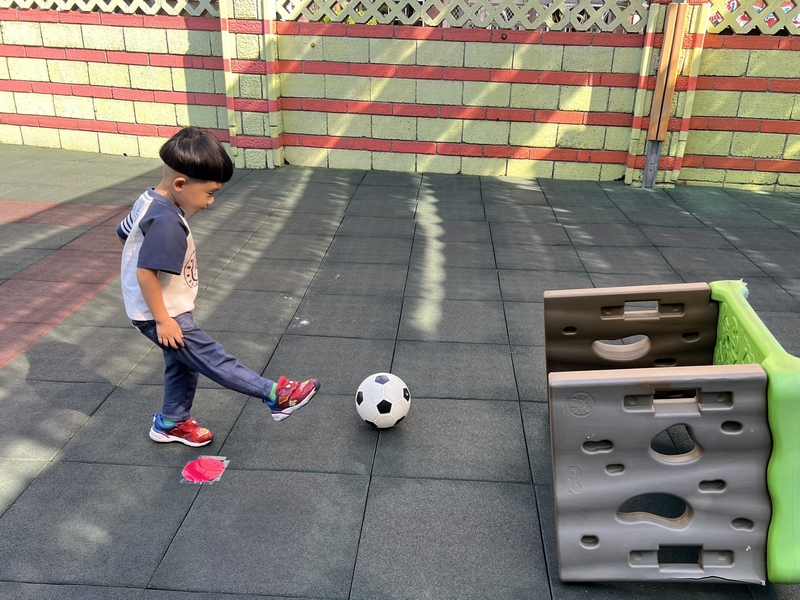 老師準備高爾夫遊戲球具,讓小朋友實際揮桿;過程中小朋友架式十足並且享受擊球的樂趣。