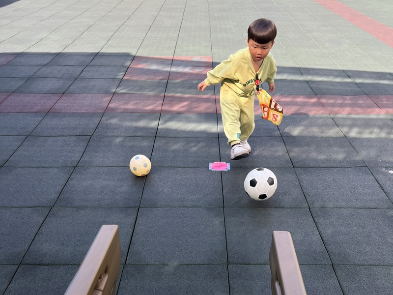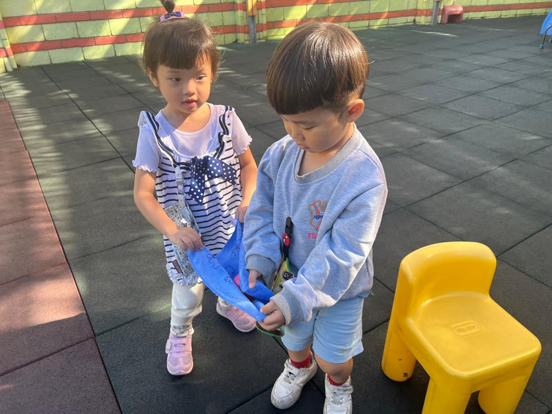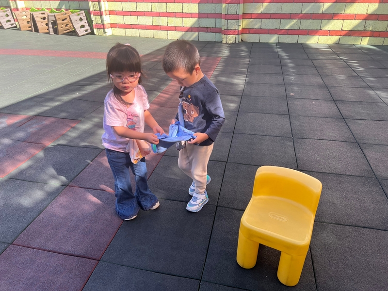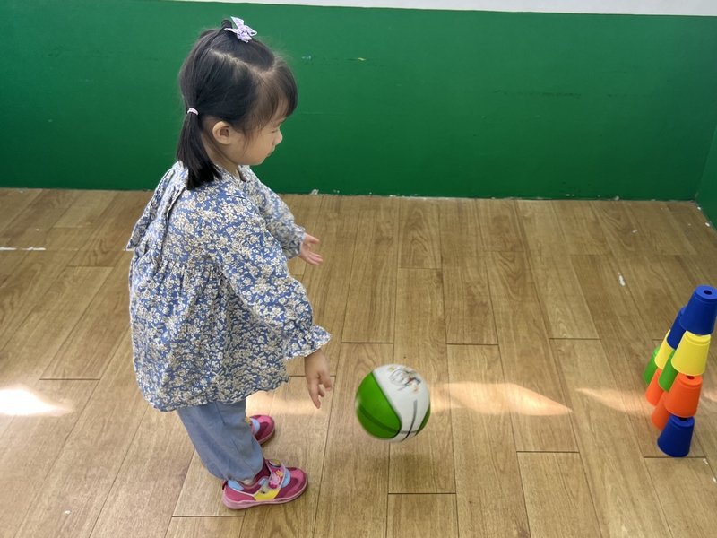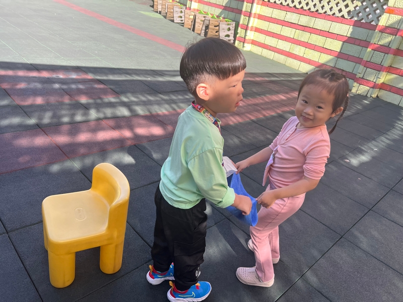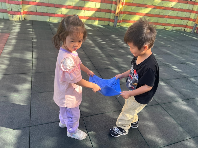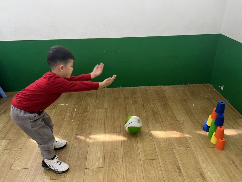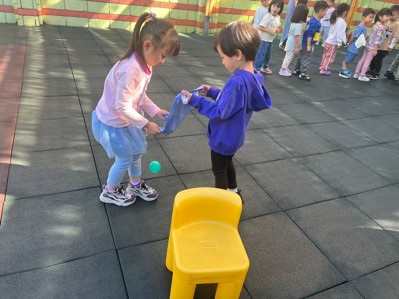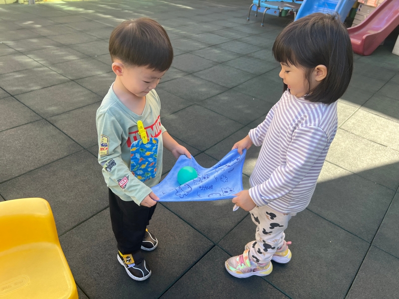 老師準備小毛巾和小皮球,讓小朋友2人一組合作,使用毛巾將球傳送至下一組小朋友;過程中開心、有趣,每個小朋友信心十足。讚!