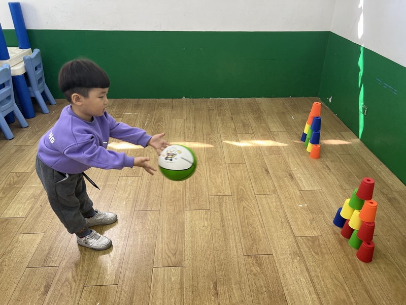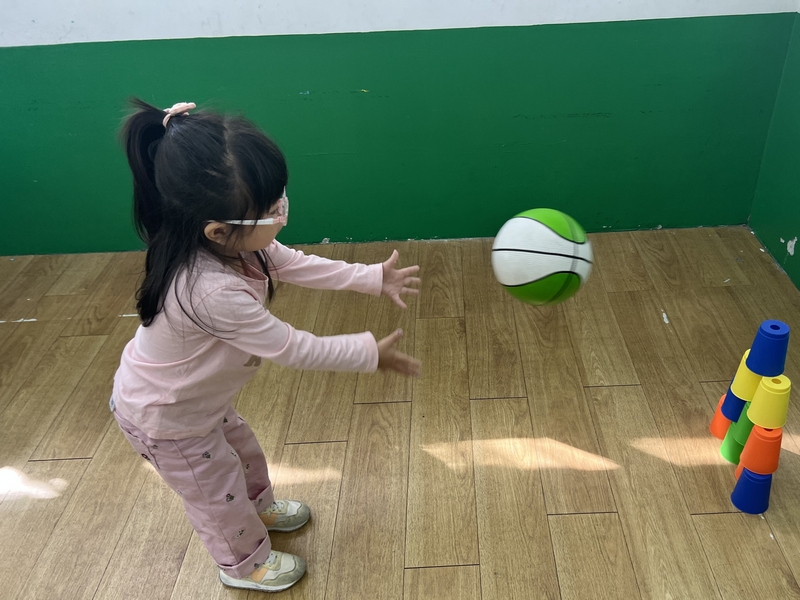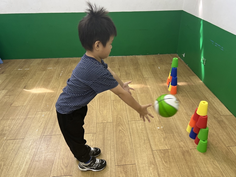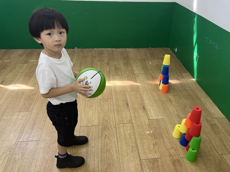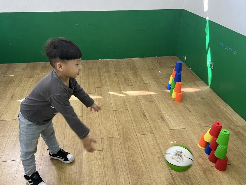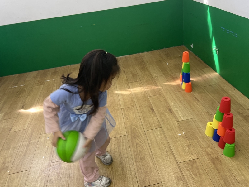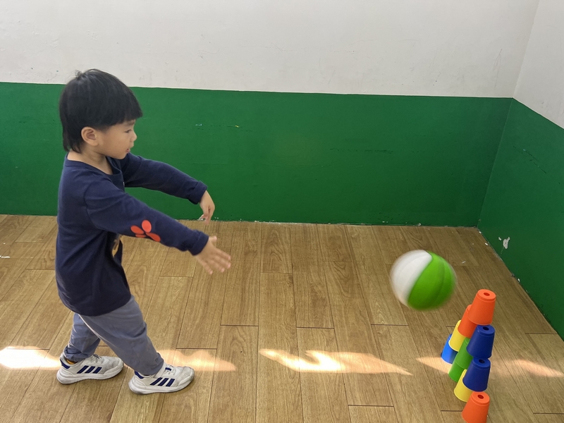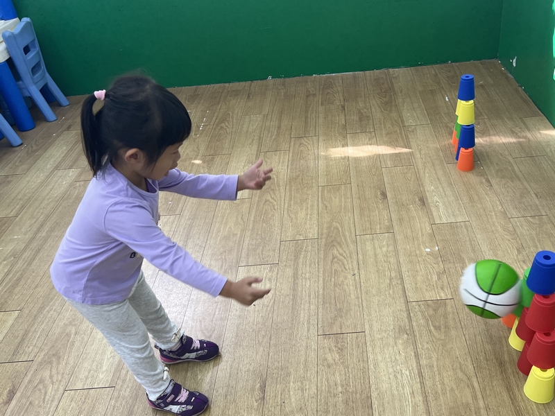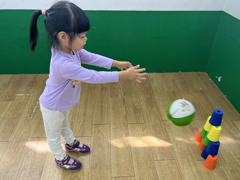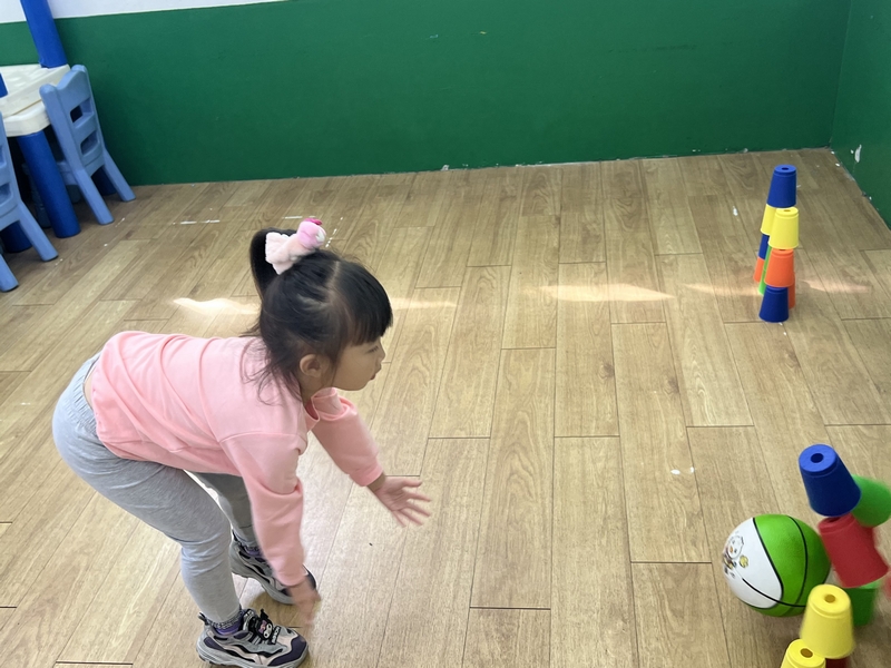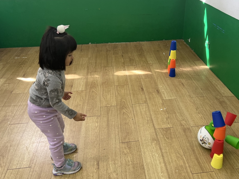 老師準備將紙杯堆疊,讓小朋友擲球擊倒。老師堆疊的紙杯,小朋友非常專注,並且開心的遊戲。