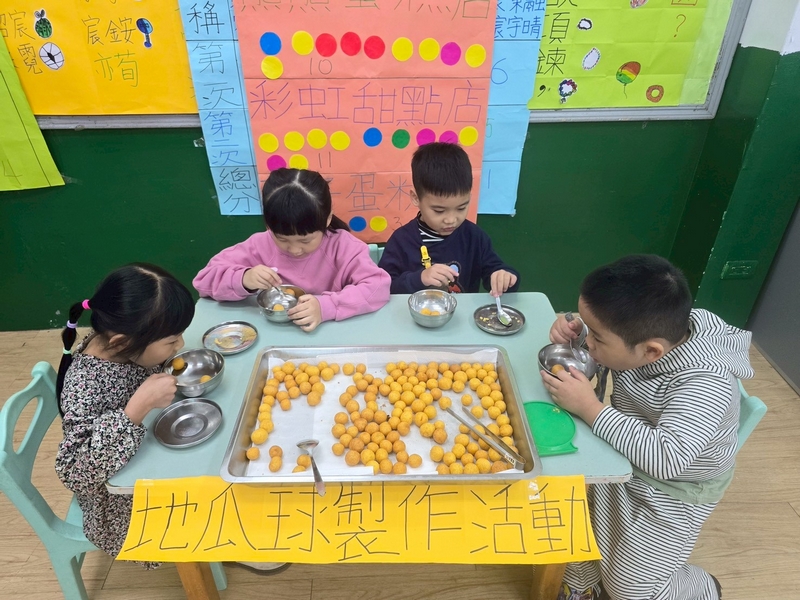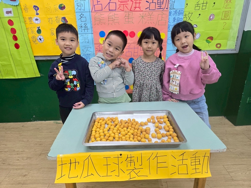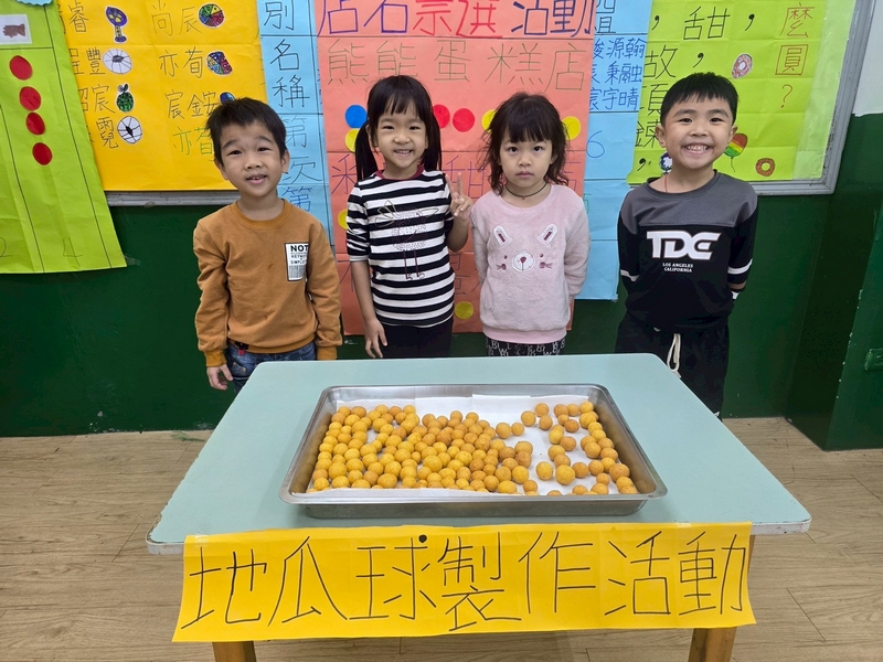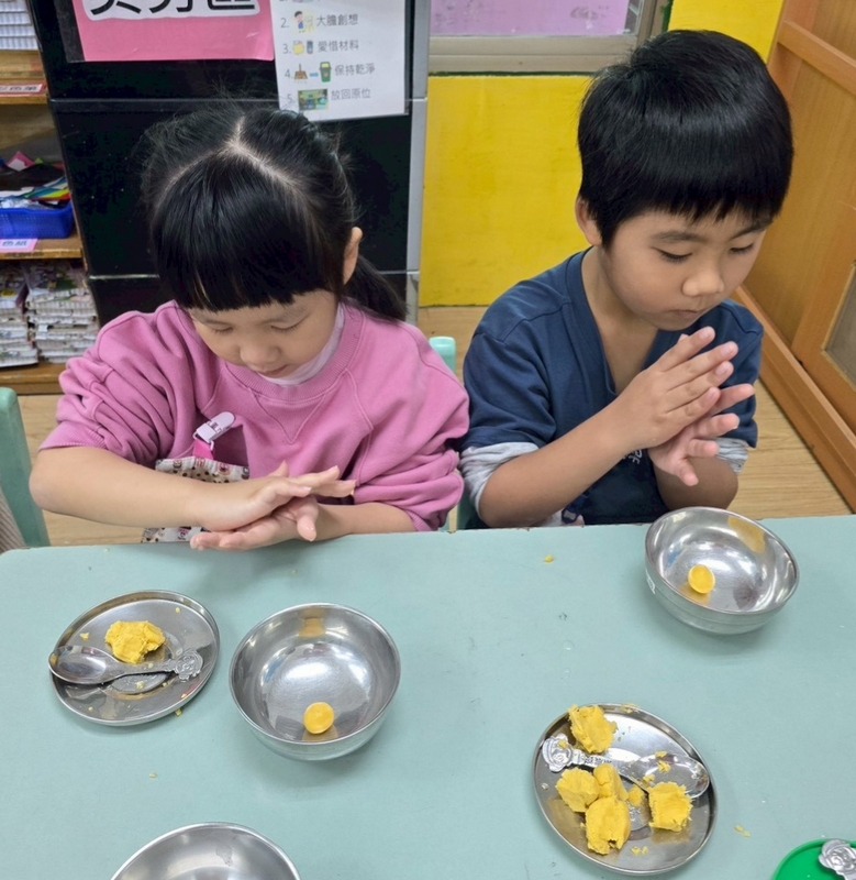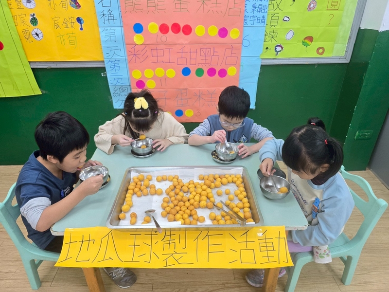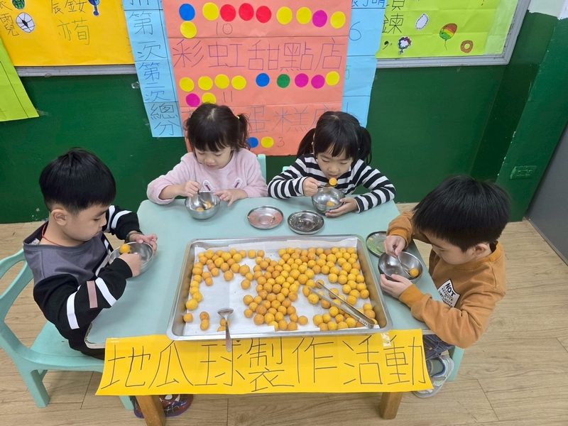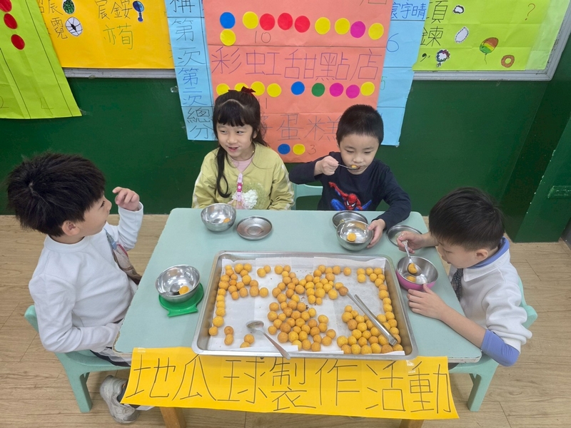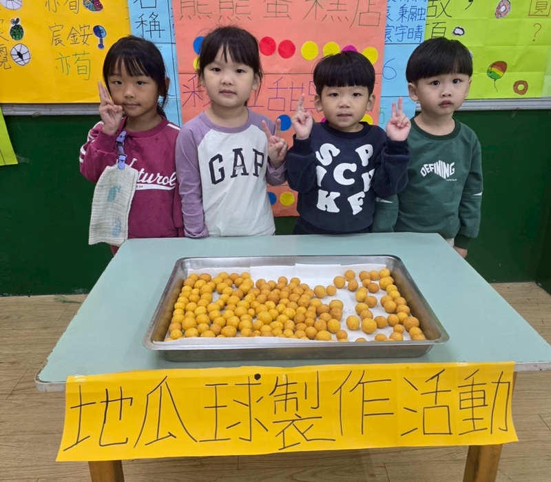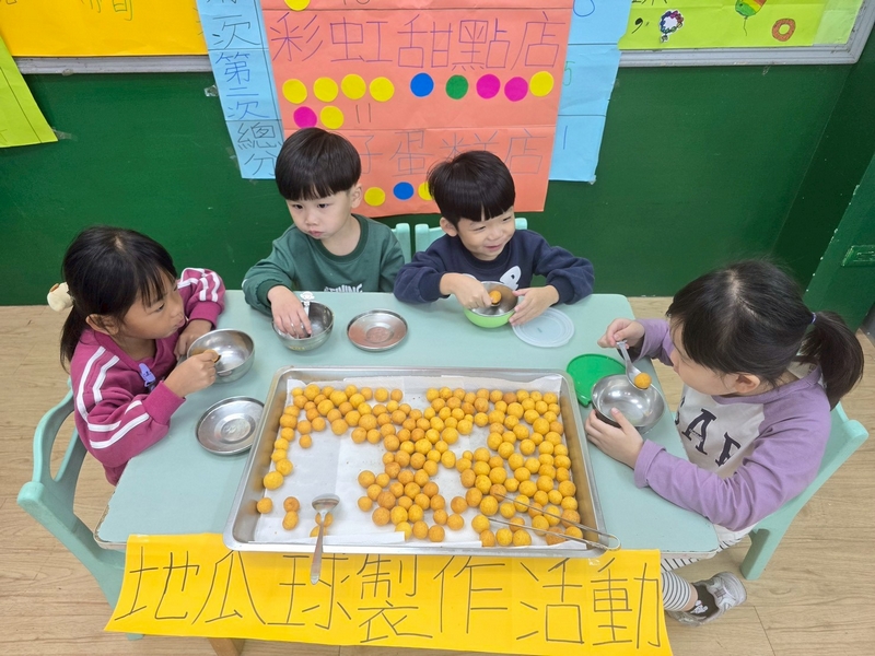 地瓜球活動讓小朋友知道,平常吃的地瓜球是什麼材料,如何來製作?才能完成好吃的地瓜球,小朋友搓圓時都很小心地搓,只是有的小朋友搓的好小顆,哈!哈!哈!這樣要怎麼來炸呢?再重新組合,再來一次就搓得很好了,請廚房阿姨幫我們炸地瓜球,小朋友看到了,笑得好開心,問老師一個人可以吃幾顆?好期待!開動時都說好好吃喔!還有小朋友問老師還有嗎?吃光光了啦!