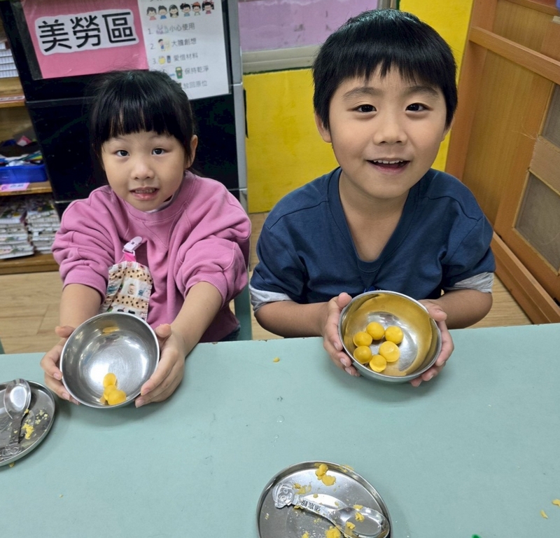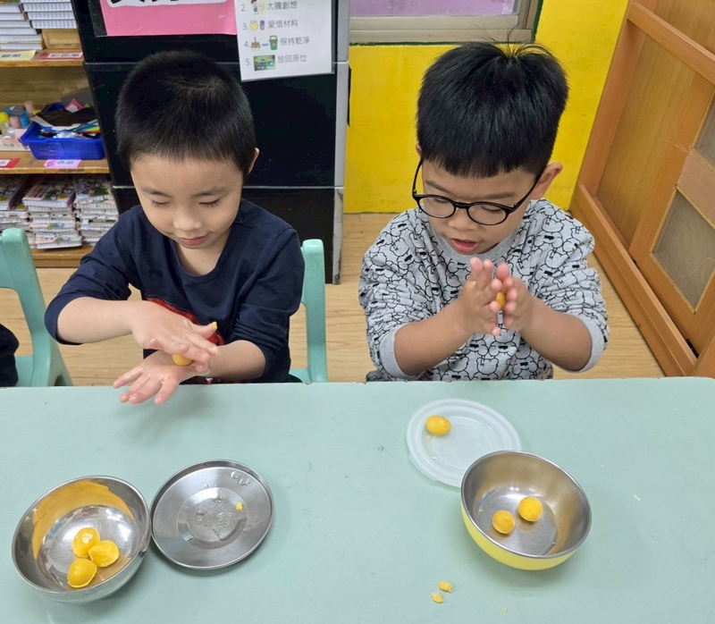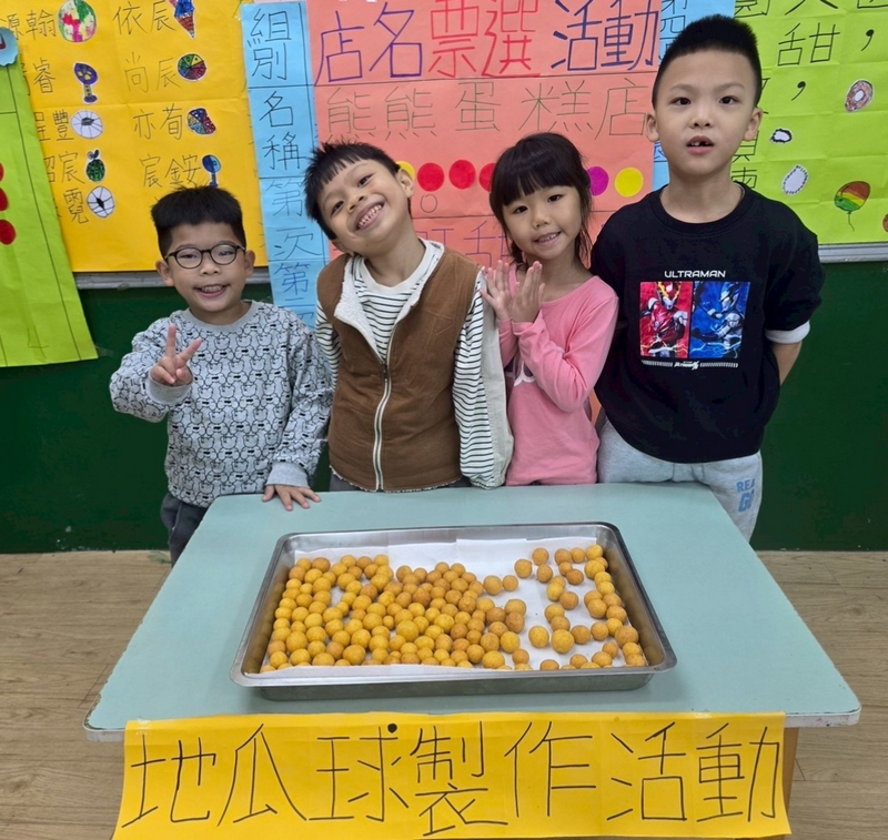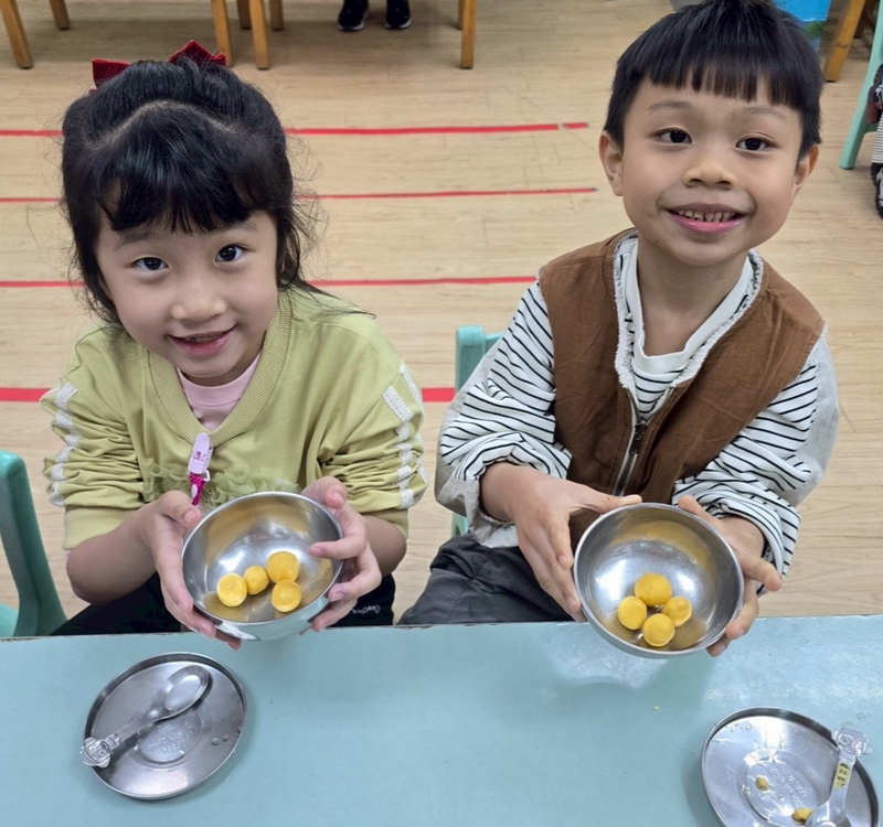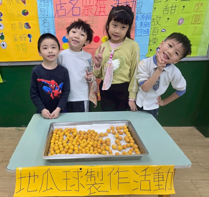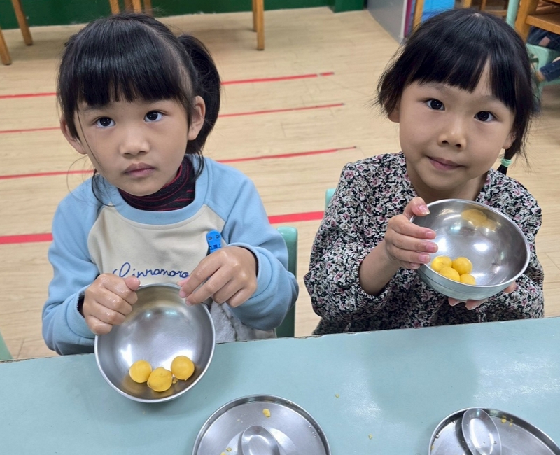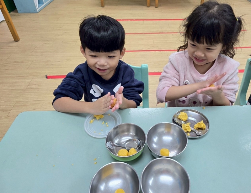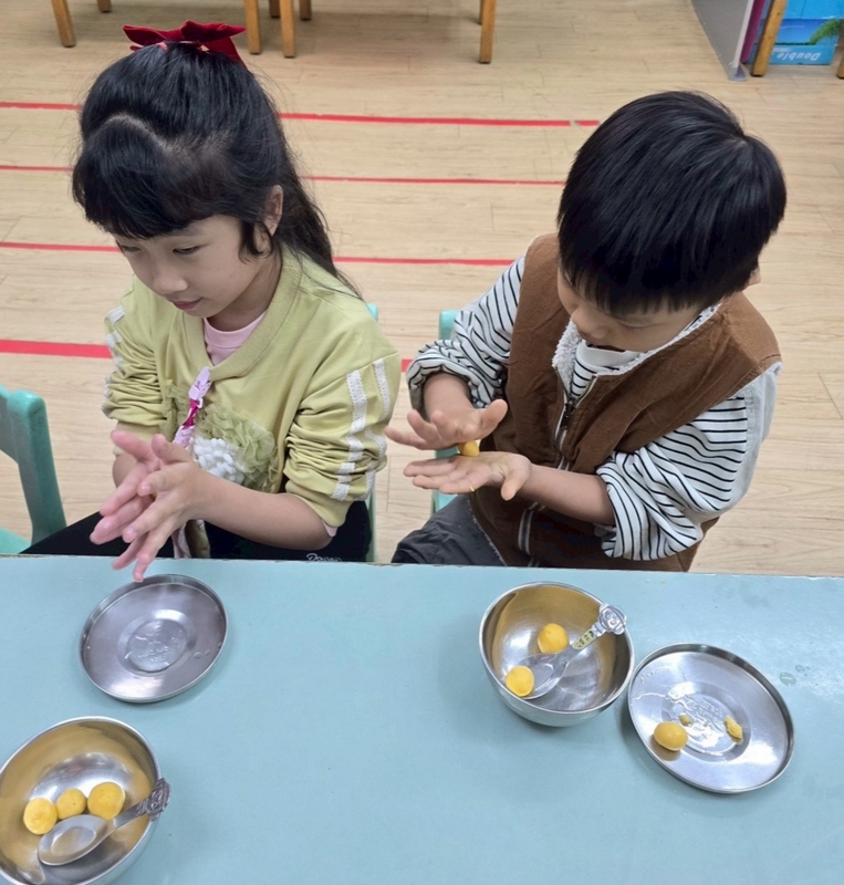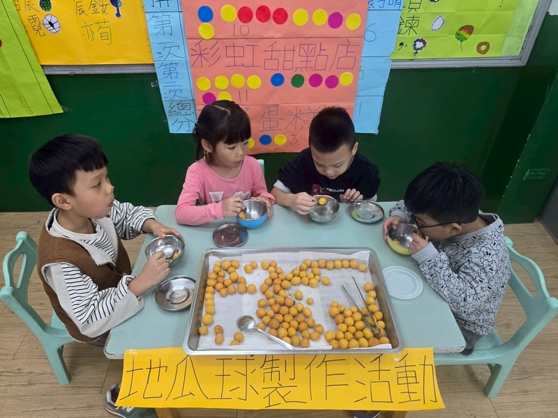地瓜球活動讓小朋友知道,平常吃的地瓜球是什麼材料,如何來製作?才能完成好吃的地瓜球,小朋友搓圓時都很小心地搓,只是有的小朋友搓的好小顆,哈!哈!哈!這樣要怎麼來炸呢?再重新組合,再來一次就搓得很好了,請廚房阿姨幫我們炸地瓜球,小朋友看到了,笑得好開心,問老師一個人可以吃幾顆?好期待!開動時都說好好吃喔!還有小朋友問老師還有嗎?吃光光了啦!