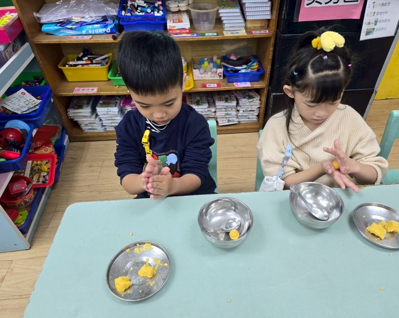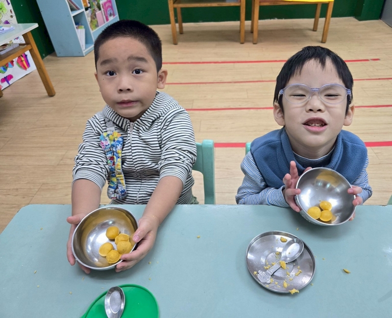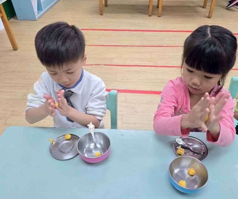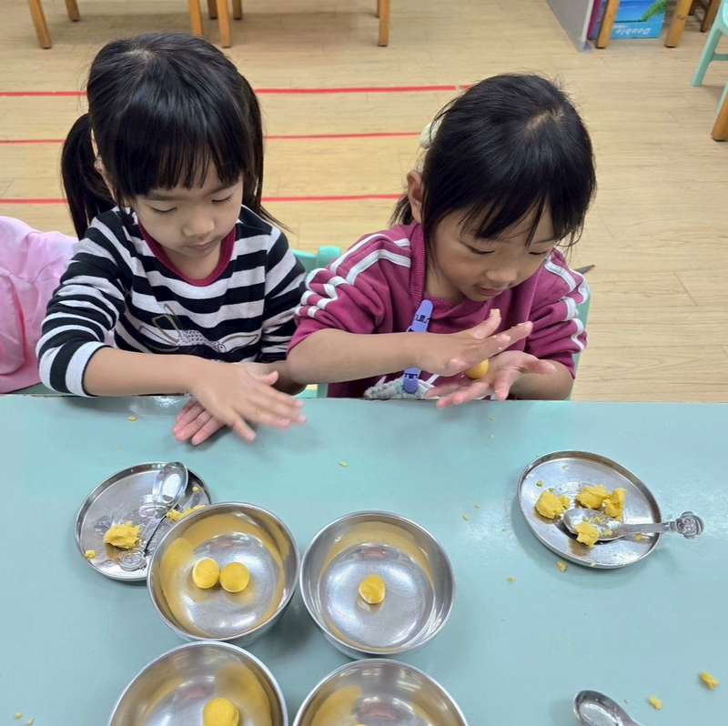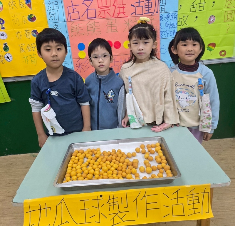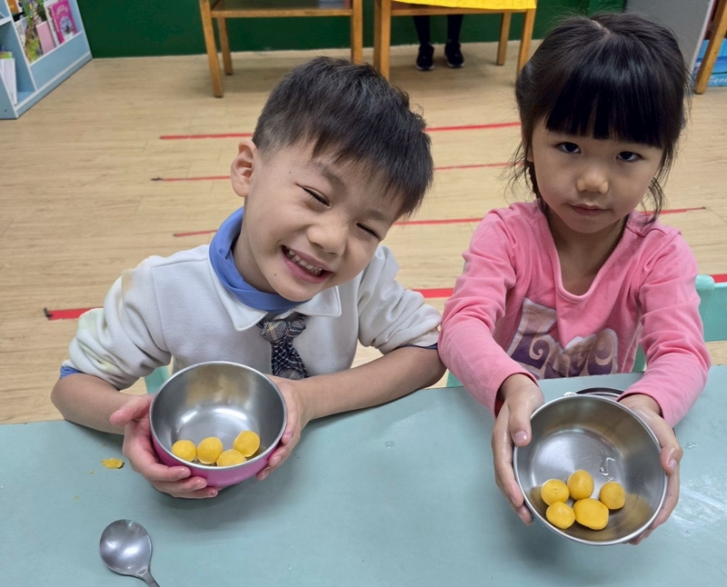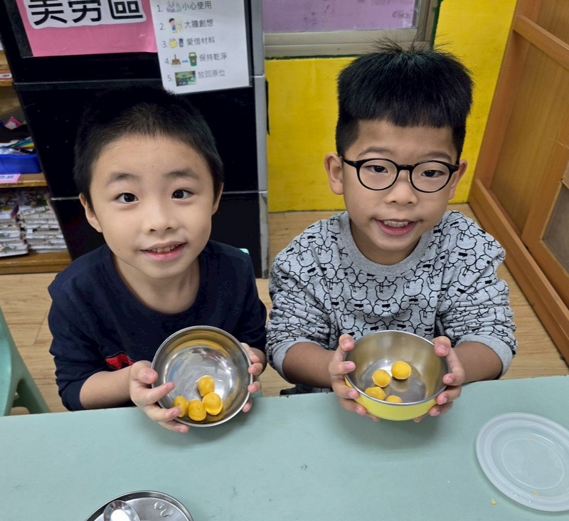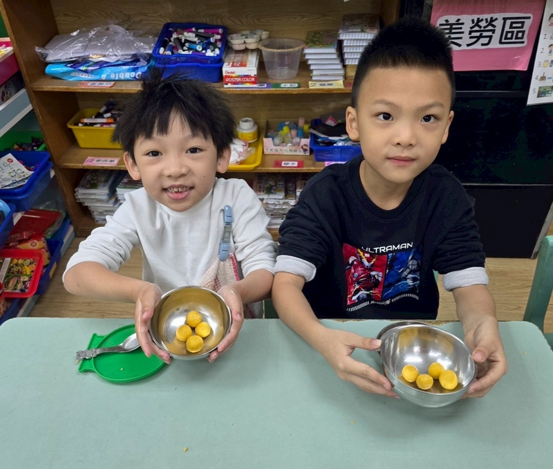 地瓜球活動讓小朋友知道,平常吃的地瓜球是什麼材料,如何來製作?才能完成好吃的地瓜球,小朋友搓圓時都很小心地搓,只是有的小朋友搓的好小顆,哈!哈!哈!這樣要怎麼來炸呢?再重新組合,再來一次就搓得很好了,請廚房阿姨幫我們炸地瓜球,小朋友看到了,笑得好開心,問老師一個人可以吃幾顆?好期待!開動時都說好好吃喔!還有小朋友問老師還有嗎?吃光光了啦!