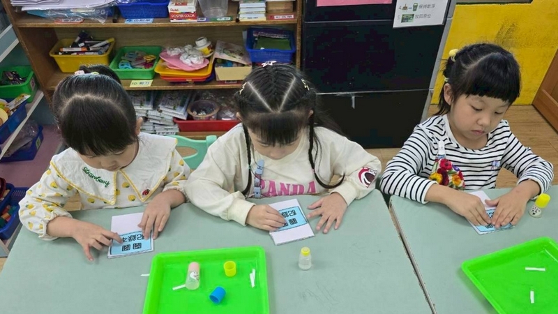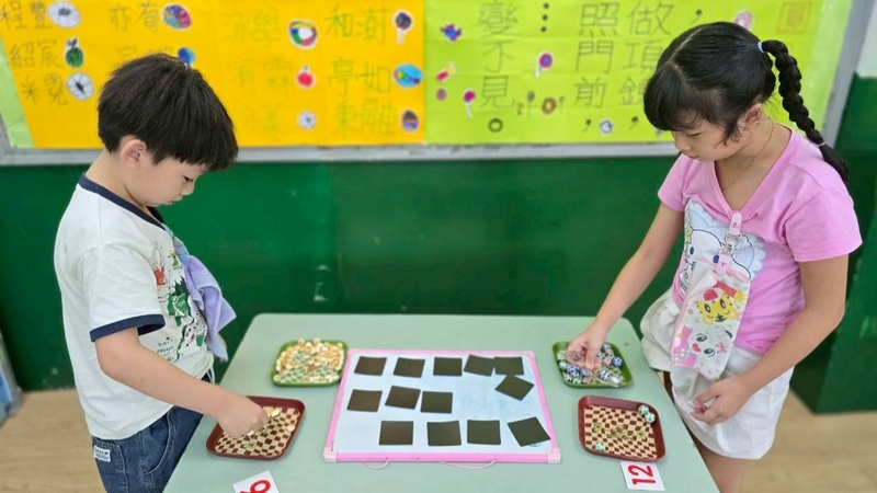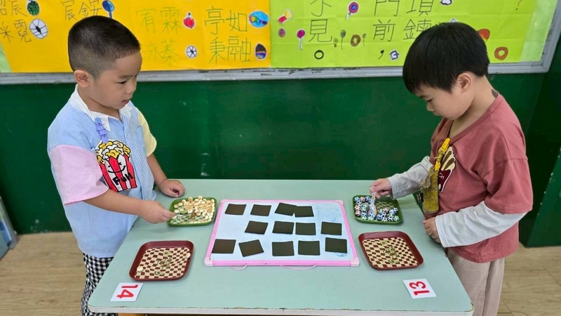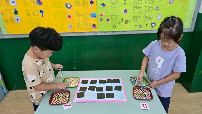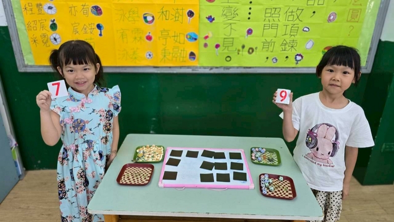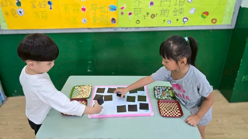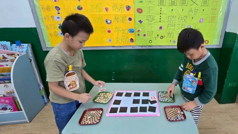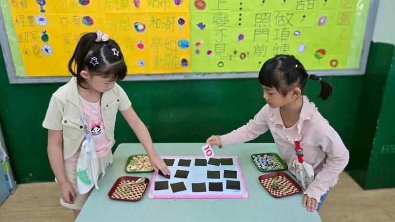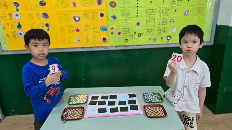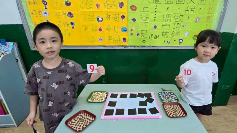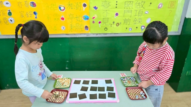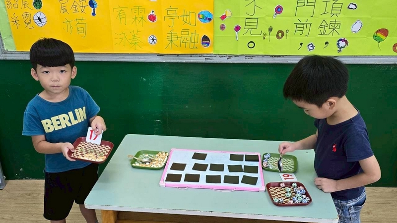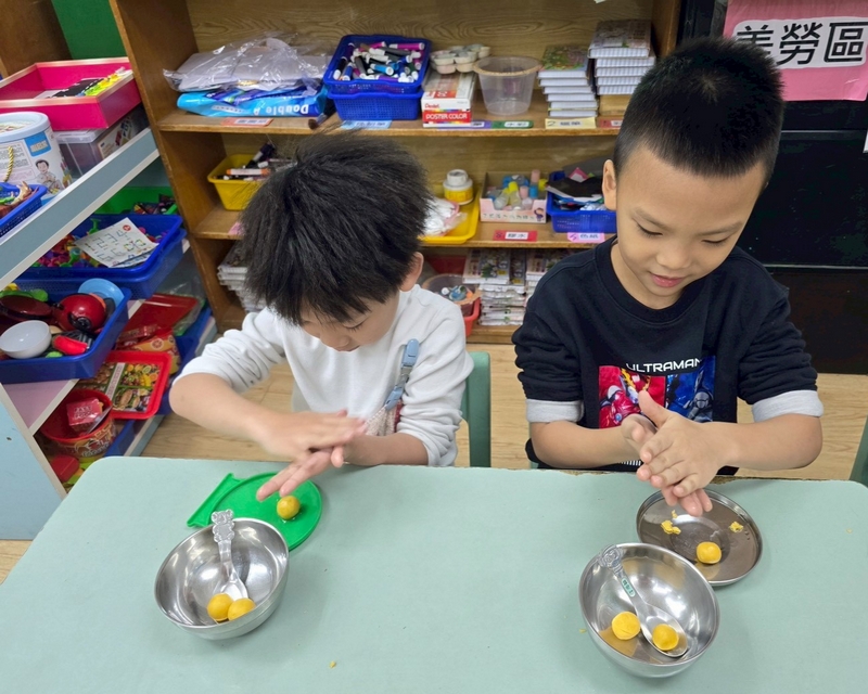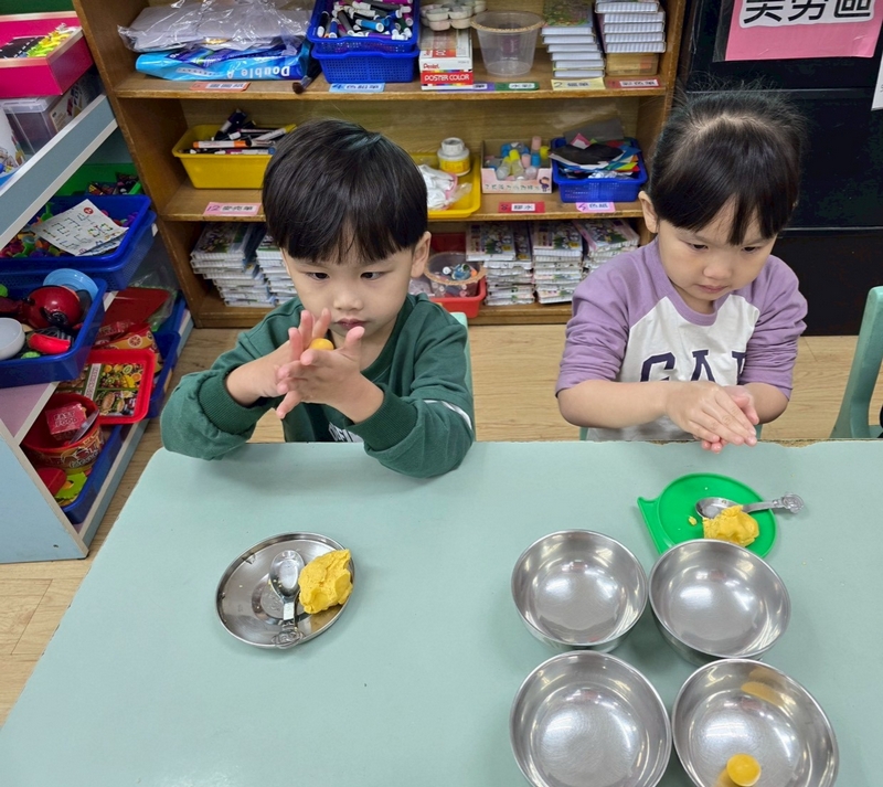 翻數字舀巧克力活動,配合主題活動,兩個小朋友一起翻數字,按照數字舀起巧克力球或圓形餅乾數量,動作要快,數量要對,就贏了!小朋友都小心地數著數量,錯了又要重來一遍,所以很專心的數著數量喔!