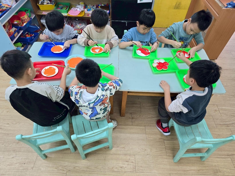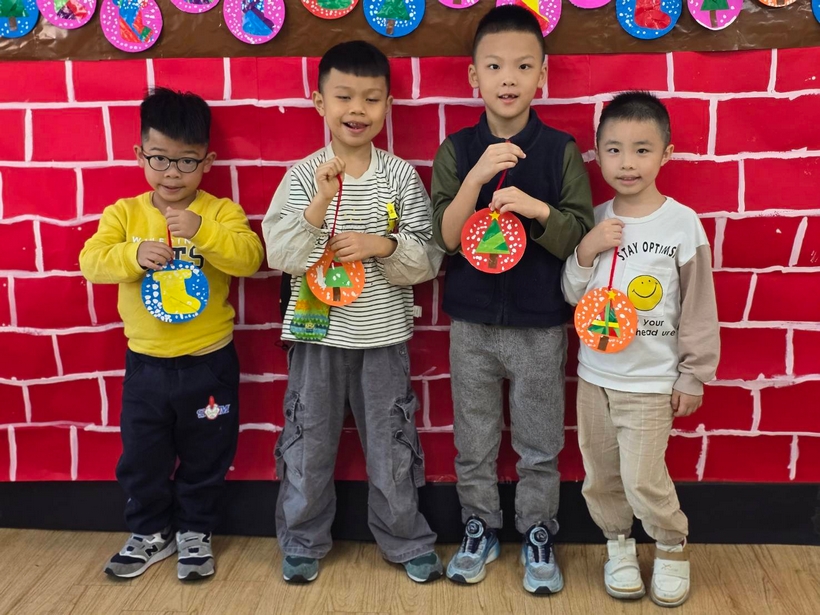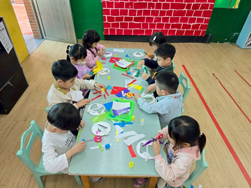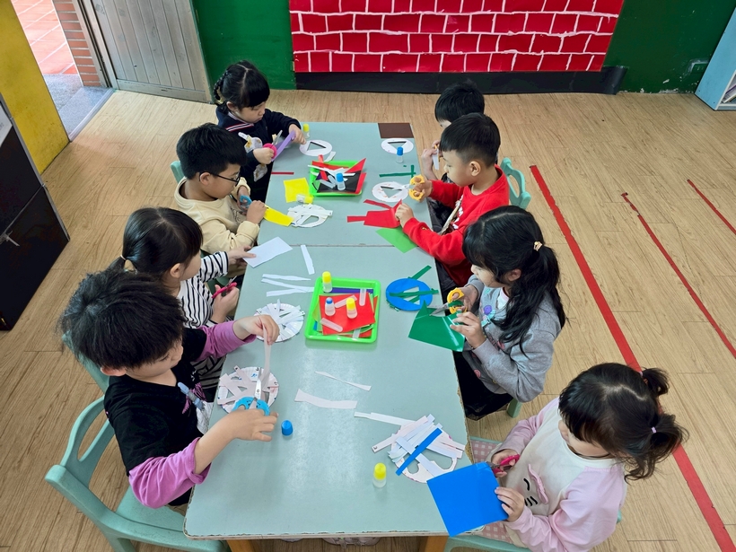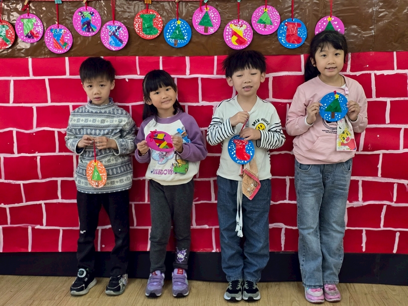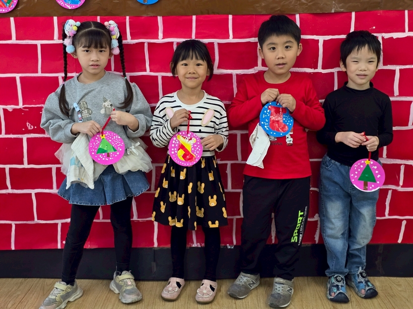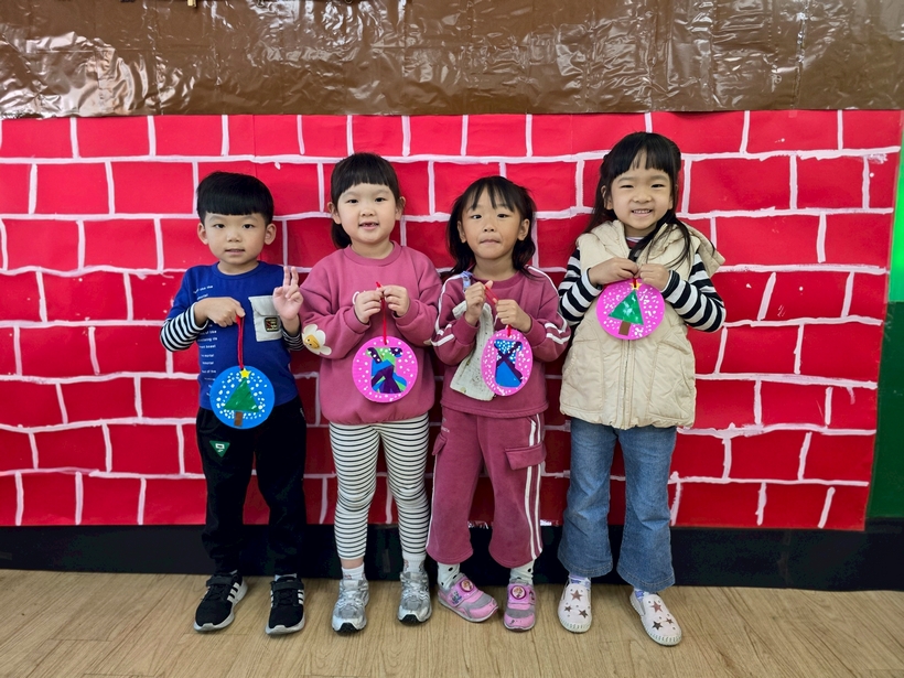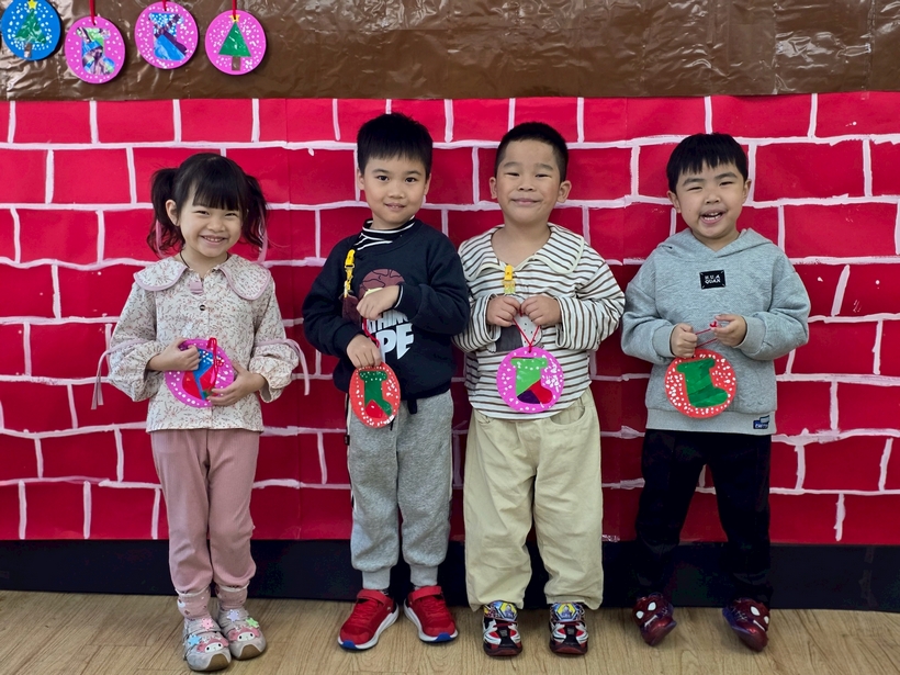 聖誕節的活動總是小朋友們最期待的時刻。在這個活動中,他們用蛋糕盤子製作聖誕吊飾。首先,小朋友們會在蛋糕盤子上畫出聖誕樹或聖誕襪的圖案,老師則讓他們自由選擇自己喜歡的造型。接著,小朋友們用心塗上自己喜愛的顏色。完成後,再將圖案部分挖空,並準備各種顏色的色紙,剪成細條狀。最後,將這些色紙條以交錯的方式貼在挖空的部分,一件既繽紛又創意十足的聖誕吊飾便完成了!
