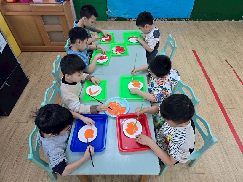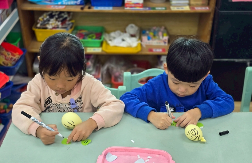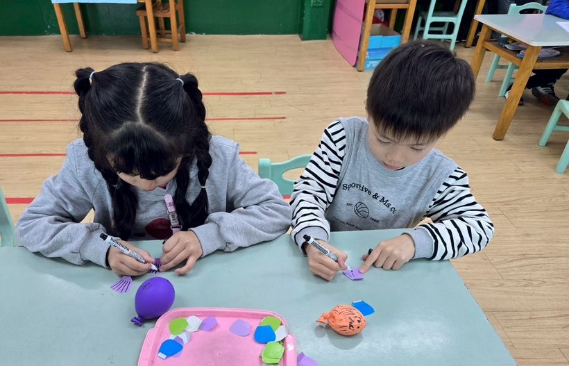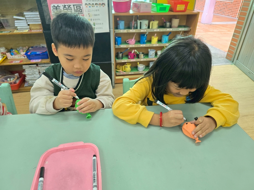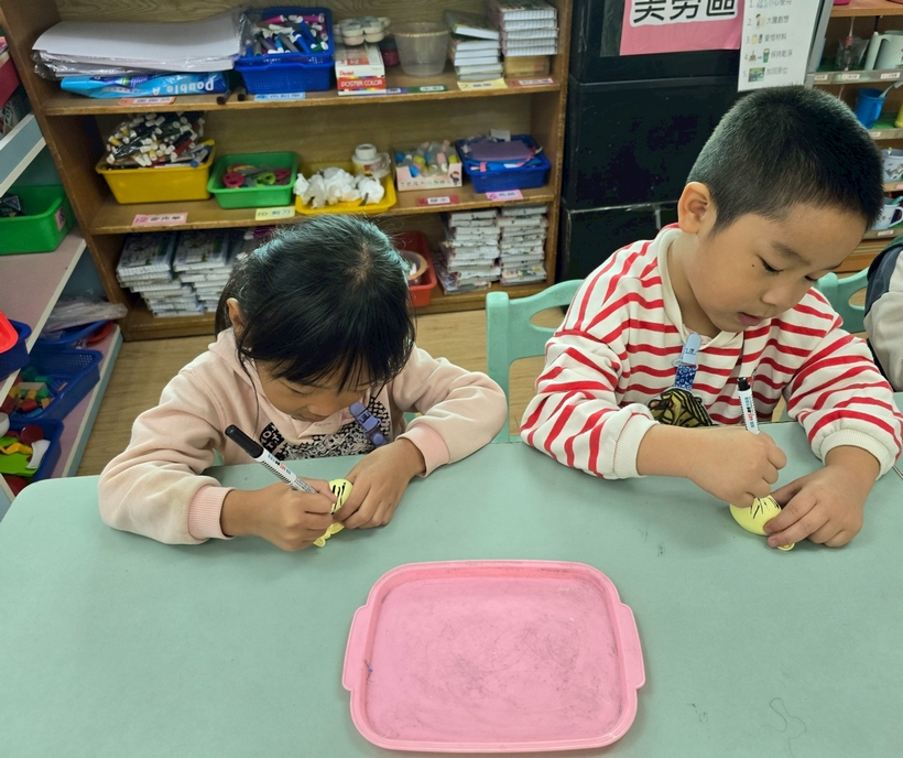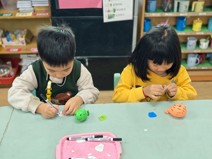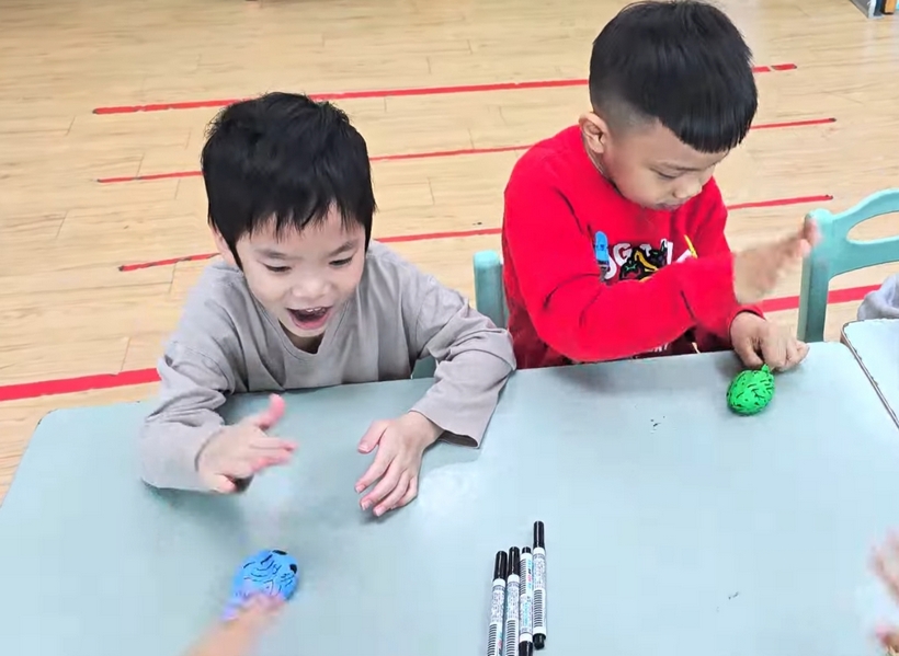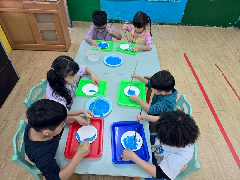 聖誕節的活動總是小朋友們最期待的時刻。在這個活動中,他們用蛋糕盤子製作聖誕吊飾。首先,小朋友們會在蛋糕盤子上畫出聖誕樹或聖誕襪的圖案,老師則讓他們自由選擇自己喜歡的造型。接著,小朋友們用心塗上自己喜愛的顏色。完成後,再將圖案部分挖空,並準備各種顏色的色紙,剪成細條狀。最後,將這些色紙條以交錯的方式貼在挖空的部分,一件既繽紛又創意十足的聖誕吊飾便完成了!