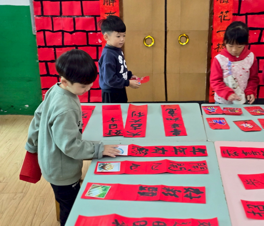 吉祥食物說吉祥話配對活動中,老師先將小朋友分成三組,一組負責寫春聯,一組畫小馬,另一組則製作紅包袋。大家分工合作,完成準備工作後,便進入紅包袋抽圖片的活動,這部分也分組進行。活動規則是看自己抽到的圖片代表哪句吉祥話,再將圖片放到相應的位置。