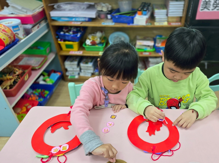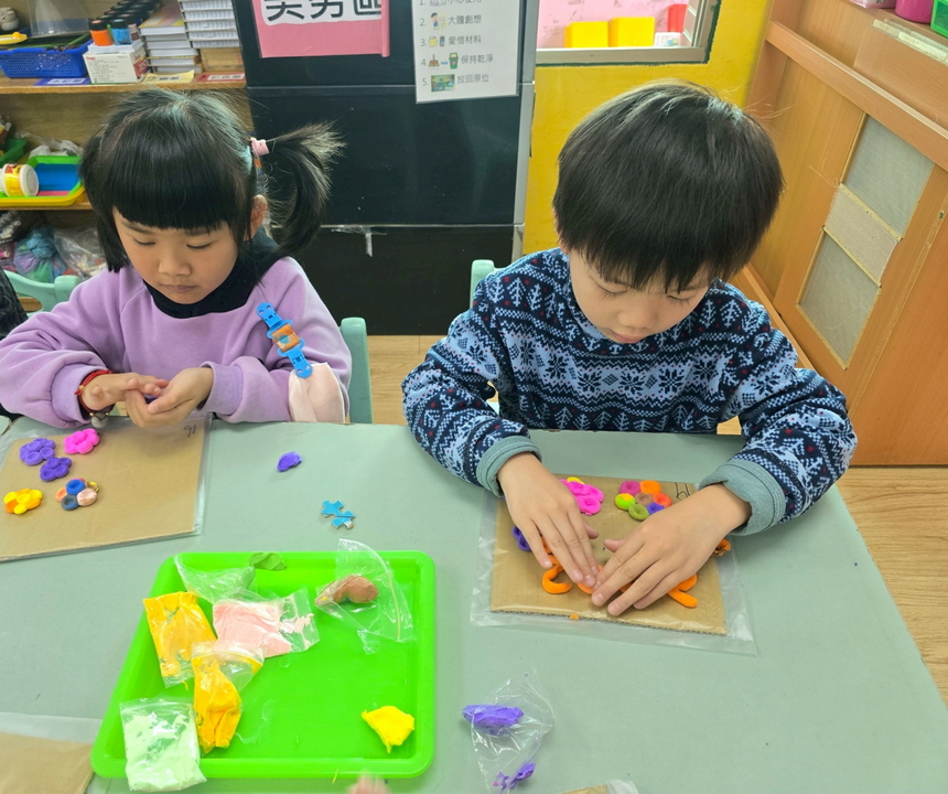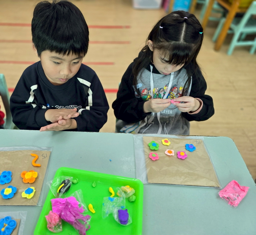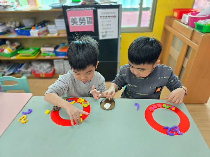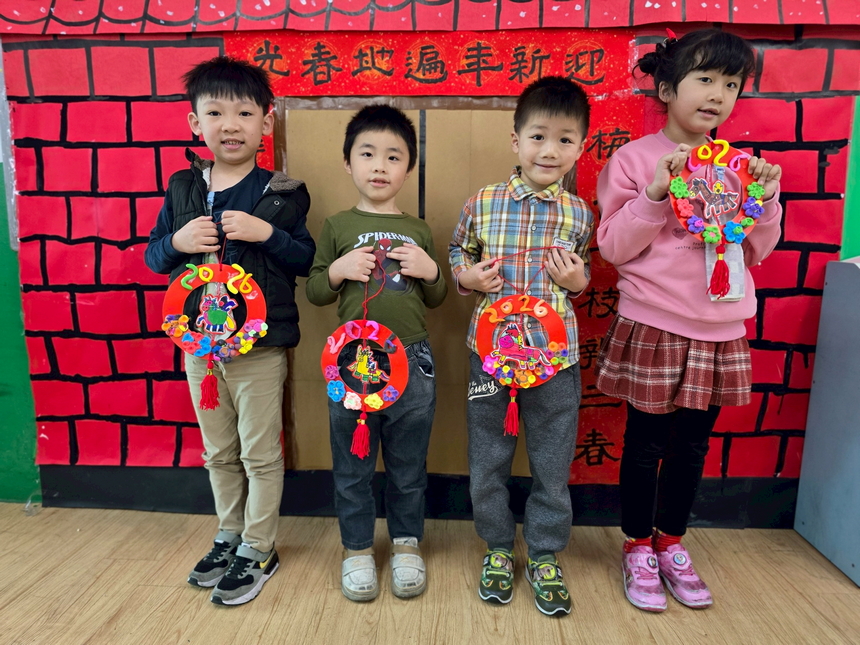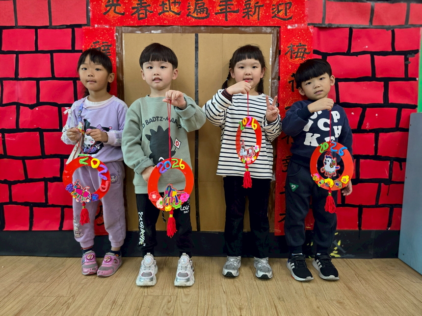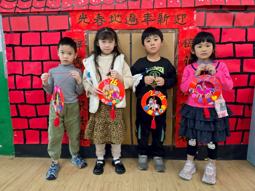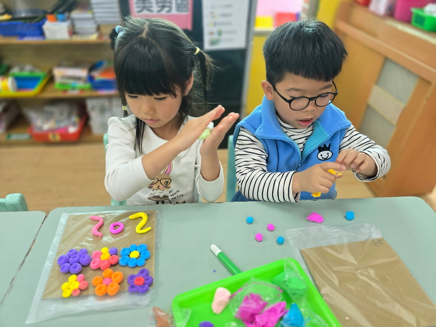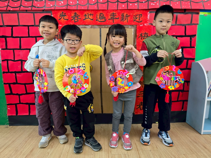 馬年行大運吊飾活動分組進行,小朋友用輕黏土捏出5朵花,再用彩色筆蓋壓出紋路,接著捏出2026的數字,將花朵和數字擺放在紙板上製作。有些小朋友專注完成作品,做得既漂亮又用心,但也有孩子調皮地揉黏土成一大球玩得開心,引起其他人的抗議。老師耐心引導他們把揉成一團的黏土搓成花朵,有人笑說這樣花朵會變黑,但老師鼓勵他們,說這樣的花也很美。等輕黏土乾後,孩子們依照想法排列花朵和數字,用白膠固定,再繪製可愛的小馬和吉祥話裝飾,剪下來貼上吊飾,馬年行大運吊飾便完成了!