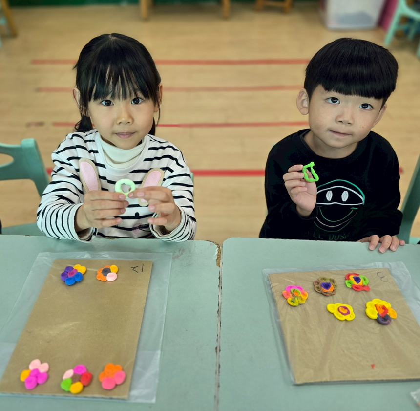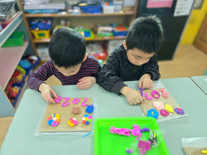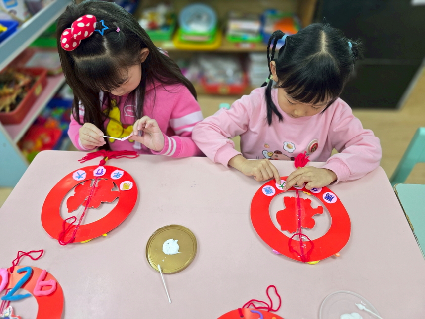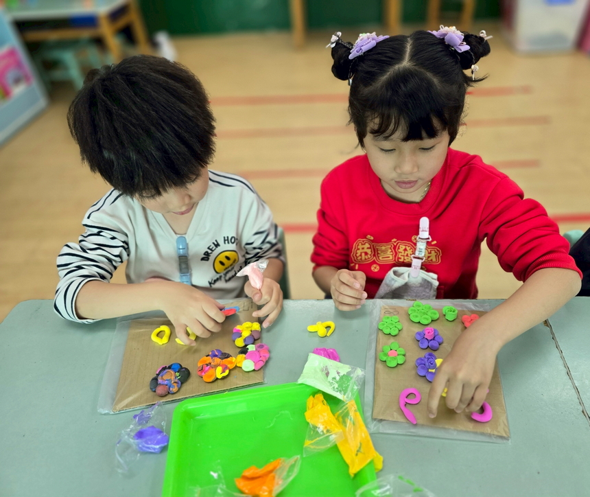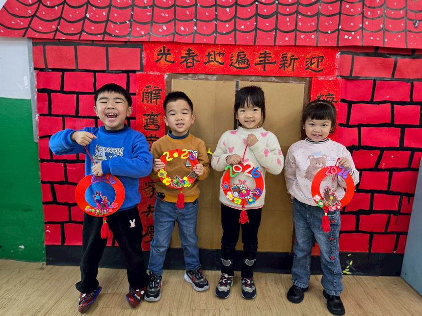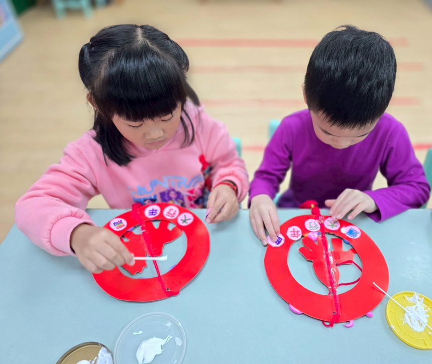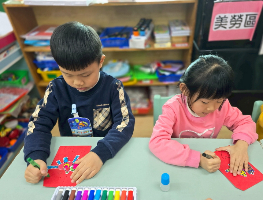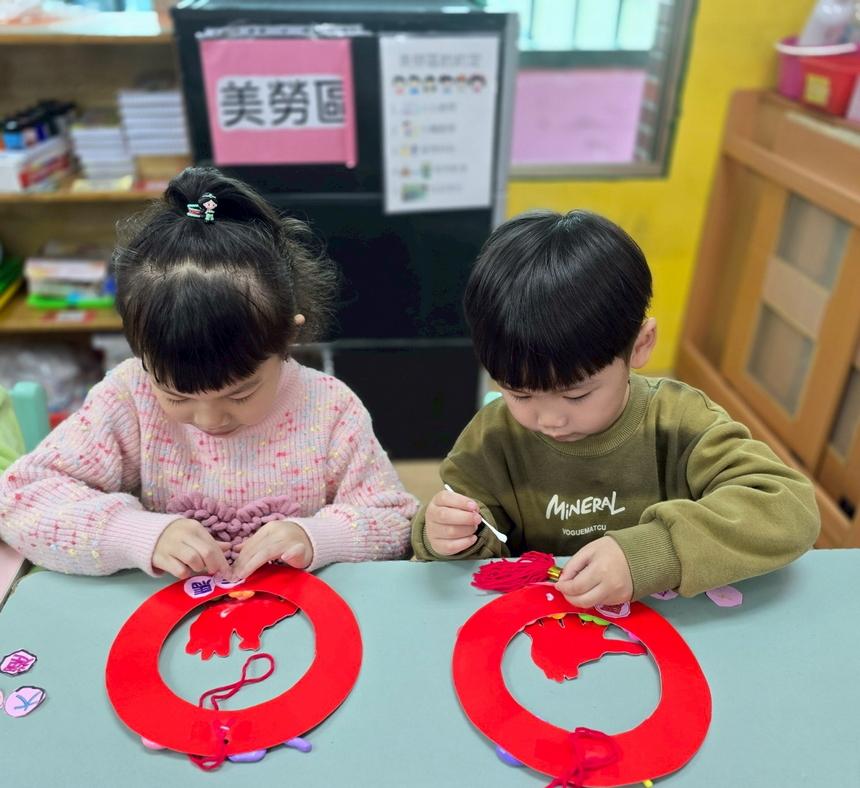 馬年行大運吊飾活動分組進行,小朋友用輕黏土捏出5朵花,再用彩色筆蓋壓出紋路,接著捏出2026的數字,將花朵和數字擺放在紙板上製作。有些小朋友專注完成作品,做得既漂亮又用心,但也有孩子調皮地揉黏土成一大球玩得開心,引起其他人的抗議。老師耐心引導他們把揉成一團的黏土搓成花朵,有人笑說這樣花朵會變黑,但老師鼓勵他們,說這樣的花也很美。等輕黏土乾後,孩子們依照想法排列花朵和數字,用白膠固定,再繪製可愛的小馬和吉祥話裝飾,剪下來貼上吊飾,馬年行大運吊飾便完成了!