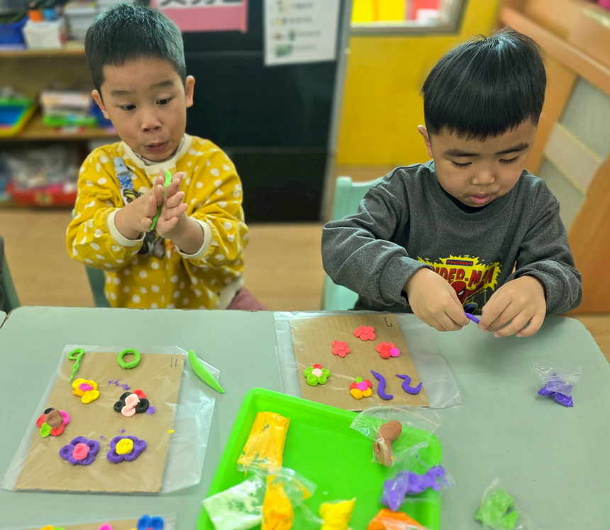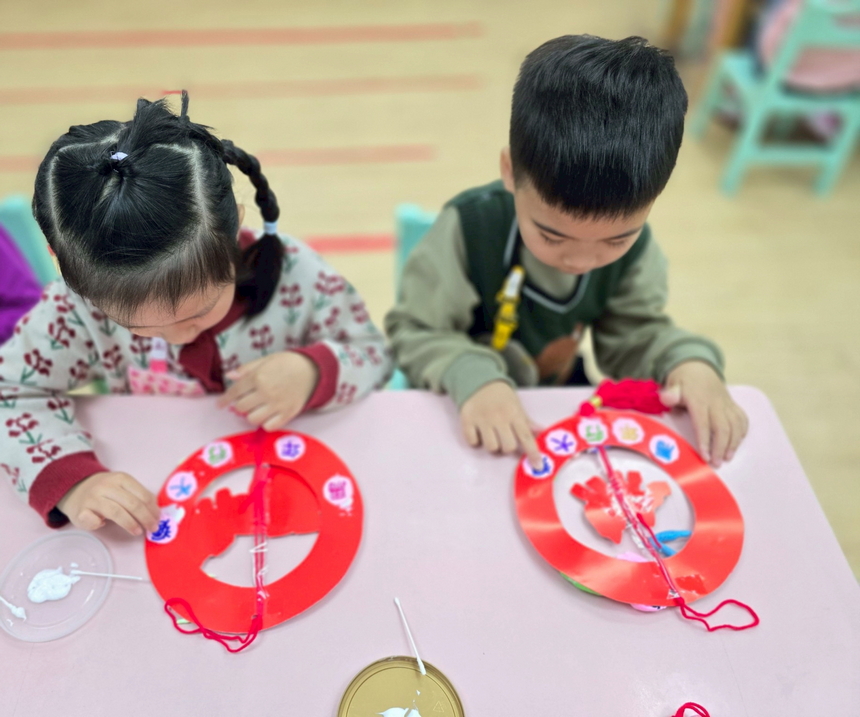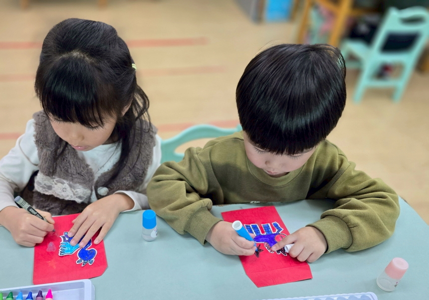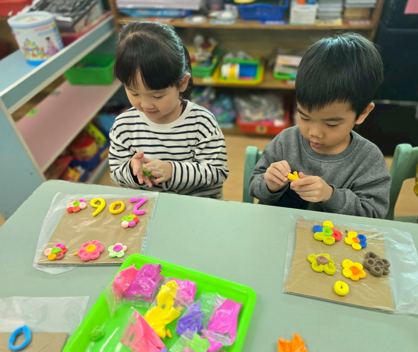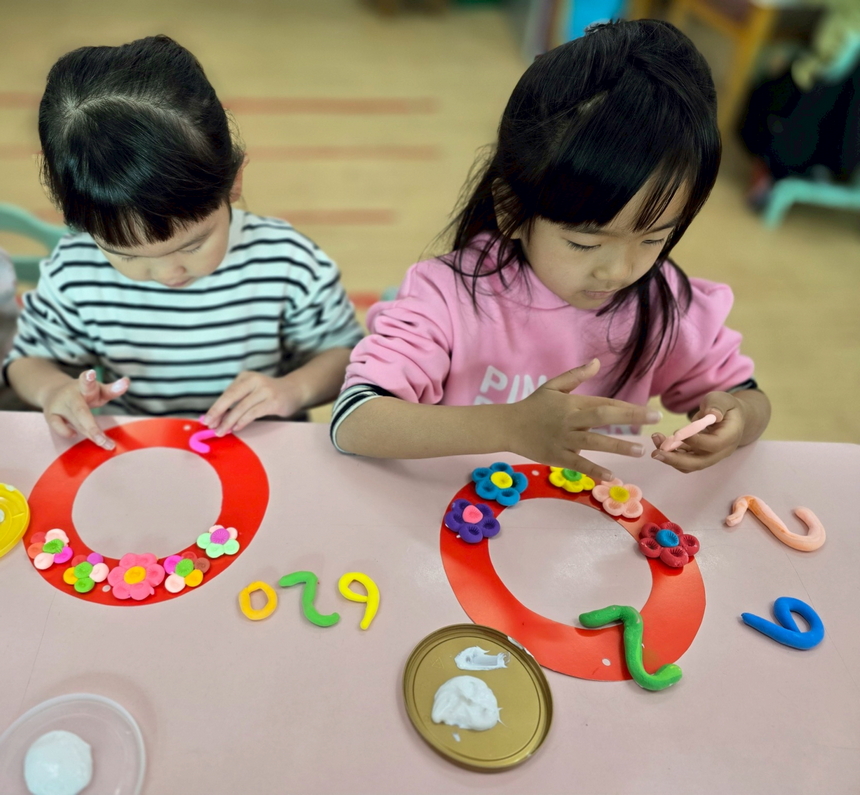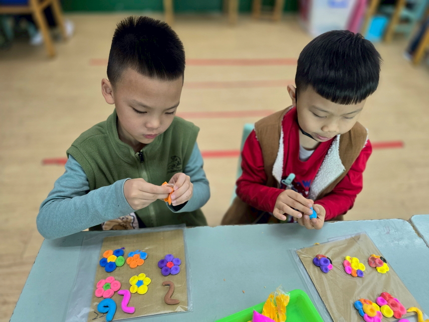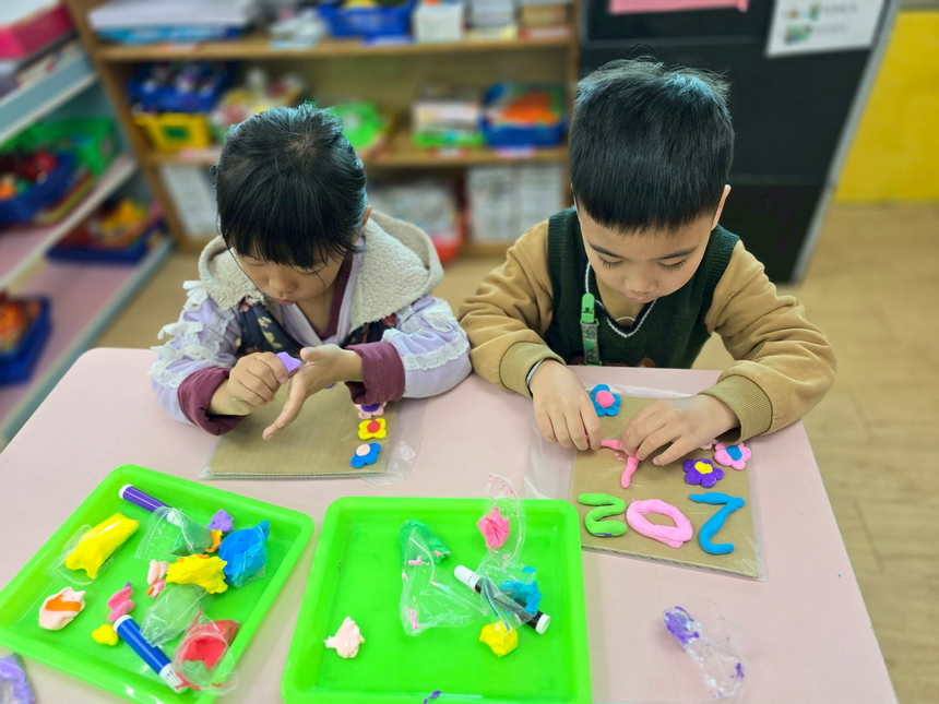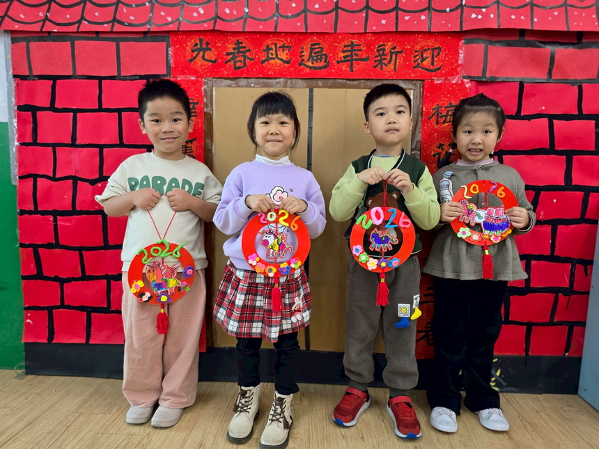 馬年行大運吊飾活動分組進行,小朋友用輕黏土捏出5朵花,再用彩色筆蓋壓出紋路,接著捏出2026的數字,將花朵和數字擺放在紙板上製作。有些小朋友專注完成作品,做得既漂亮又用心,但也有孩子調皮地揉黏土成一大球玩得開心,引起其他人的抗議。老師耐心引導他們把揉成一團的黏土搓成花朵,有人笑說這樣花朵會變黑,但老師鼓勵他們,說這樣的花也很美。等輕黏土乾後,孩子們依照想法排列花朵和數字,用白膠固定,再繪製可愛的小馬和吉祥話裝飾,剪下來貼上吊飾,馬年行大運吊飾便完成了!